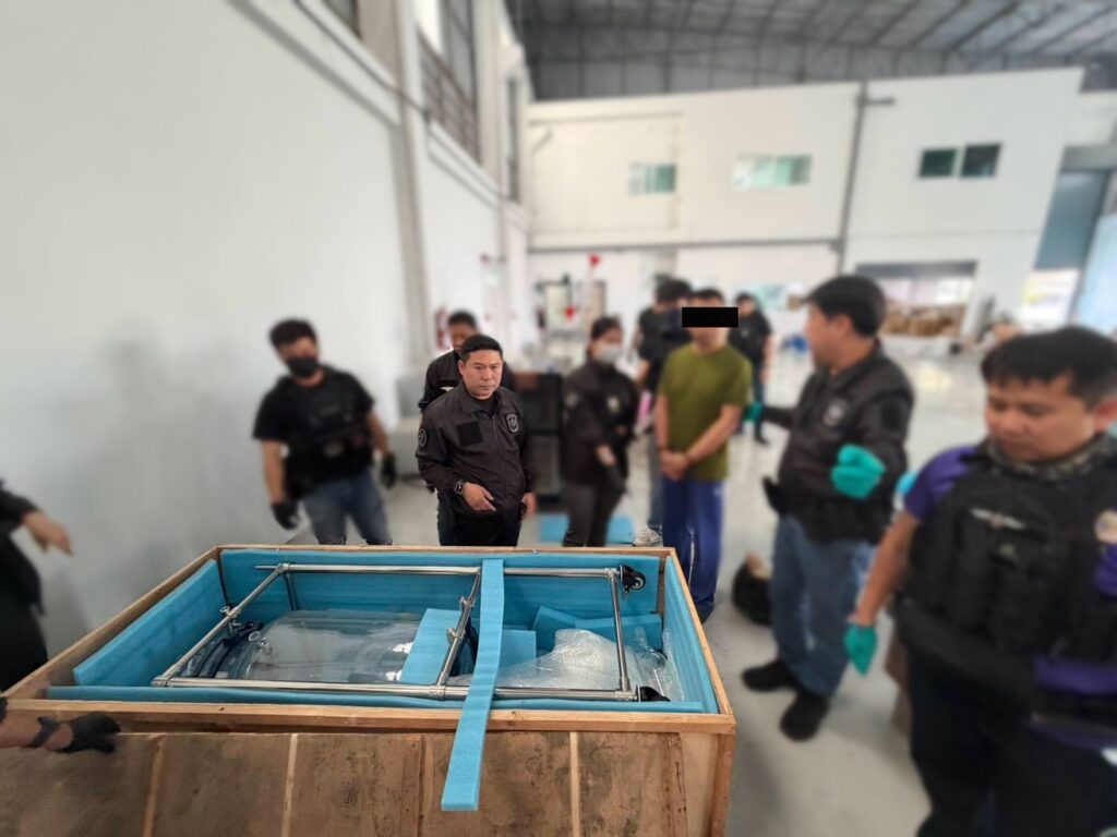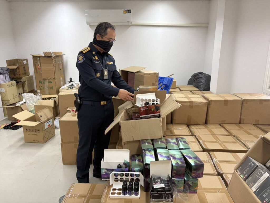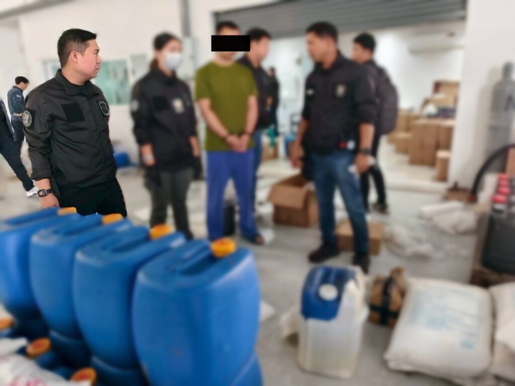 สมุทรปราการ – ป.ป.ส. เปิดปฏิบัติการบุกทลายโรงงานลับเครือข่ายชาวจีน ลักลอบผลิต “เอโทมิเดต” สารตั้งต้นผสมบุหรี่ไฟฟ้ามรณะ หรือ “บุหรี่ซอมบี้” กลางอำเภอบางบ่อ จับกุมผู้ต้องหาชาวจีน 1 ราย พร้อมของกลางสารเคมีและวัตถุดิบผลิตรวมกว่า 11.9 ตัน