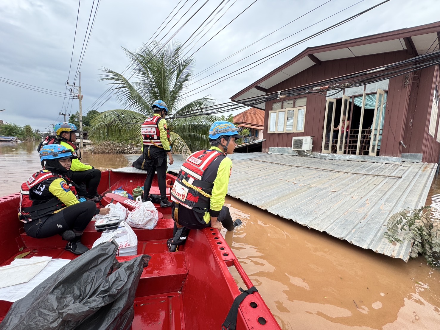 โดยทีมบรรเทาสาธารณภัยนำกู้ชีพกู้ภัยนำอาหารปรุงสุก น้ำดื่ม พร้อมยาเวชภัณฑ์ และอาหารสุนัข,แมว ลงเรือไปแจกจ่ายให้กับประชาชนในซอยวัดมณเฑียรพื้นที่อำเภอเมือง จังหวัดน่าน สภาวะน้ำบางพิ้นที่ลดลงตามลำดับ